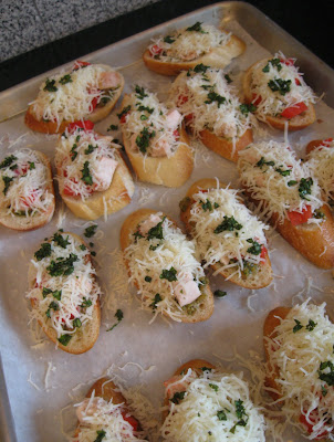 Bake brushetta in a 350 degree pre-heated oven approximately 12 minutes until completely toasted and cheese is melted.